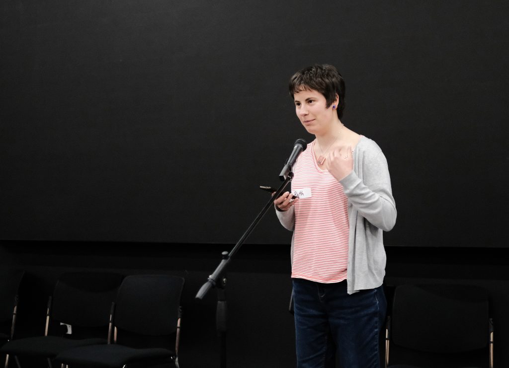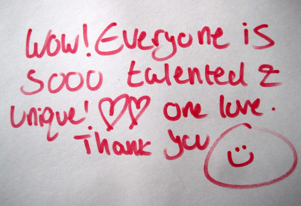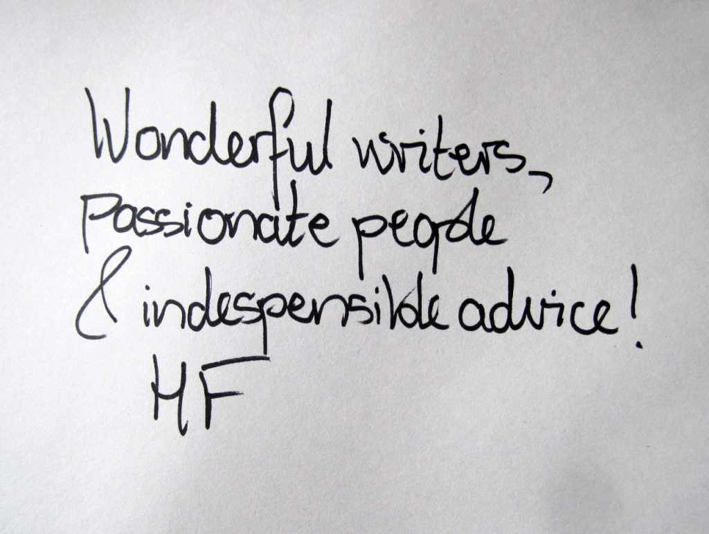 I loved the comedy workshop. I felt my work was getting a little repetitive and it was great to explore how to be more out there and delve into different themes. (SurveyMonkey feedback)And then there are the front of house heroes, headed up by the unflappable Kiran Malhi-Bearn. We really couldn’t have functioned without you lovely folks! Zoe Cox, Marcus Wrindlewald, Jane Armstrong, Tom Robbins, Kate Woodhead, Anas Kabar, Helen Angell and Liz Morley.