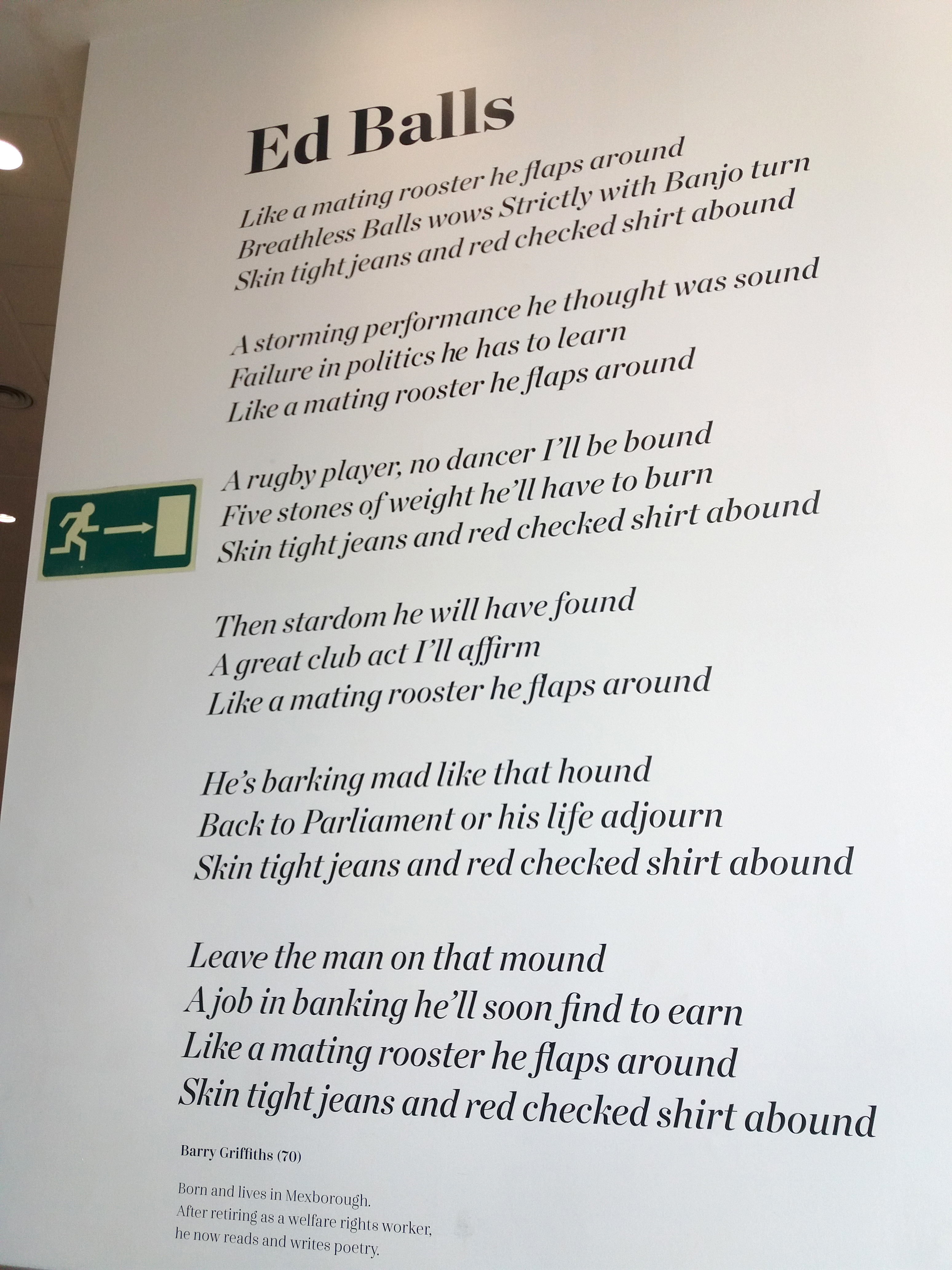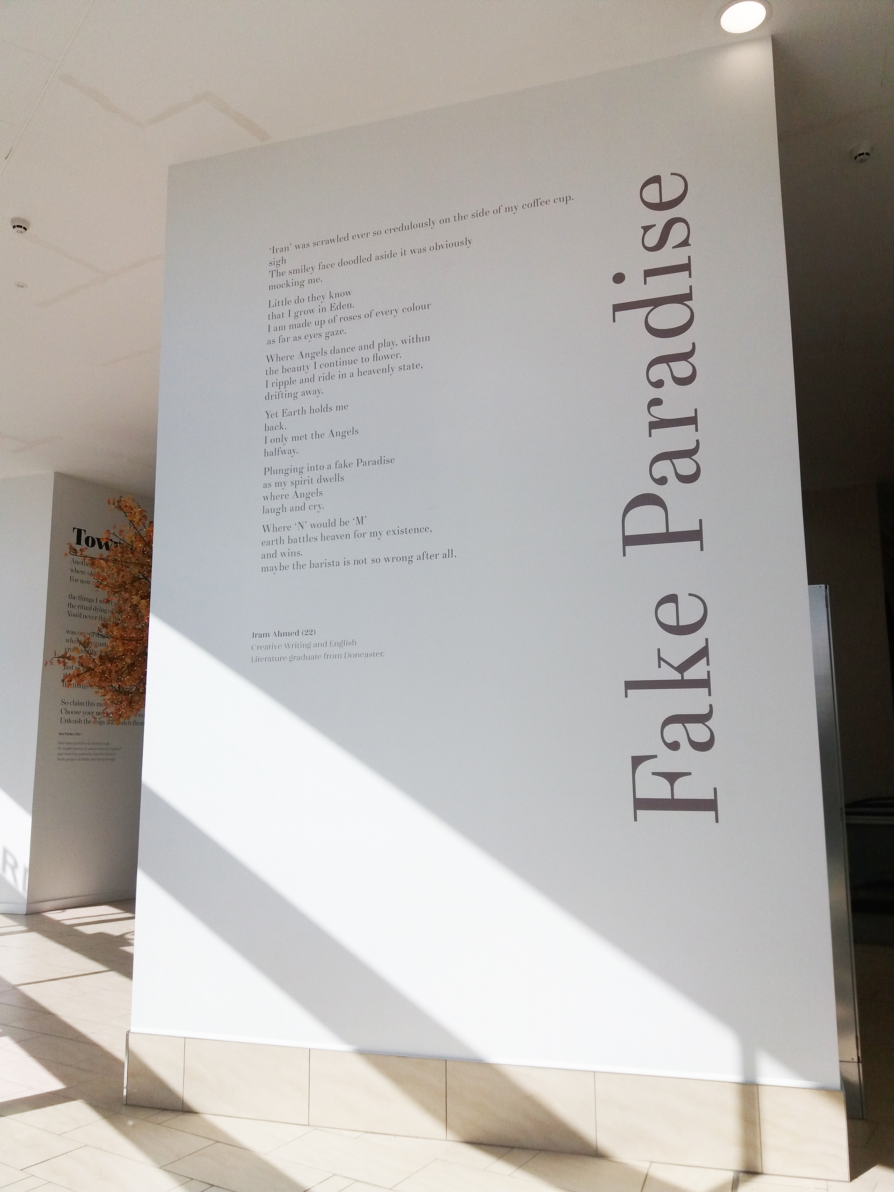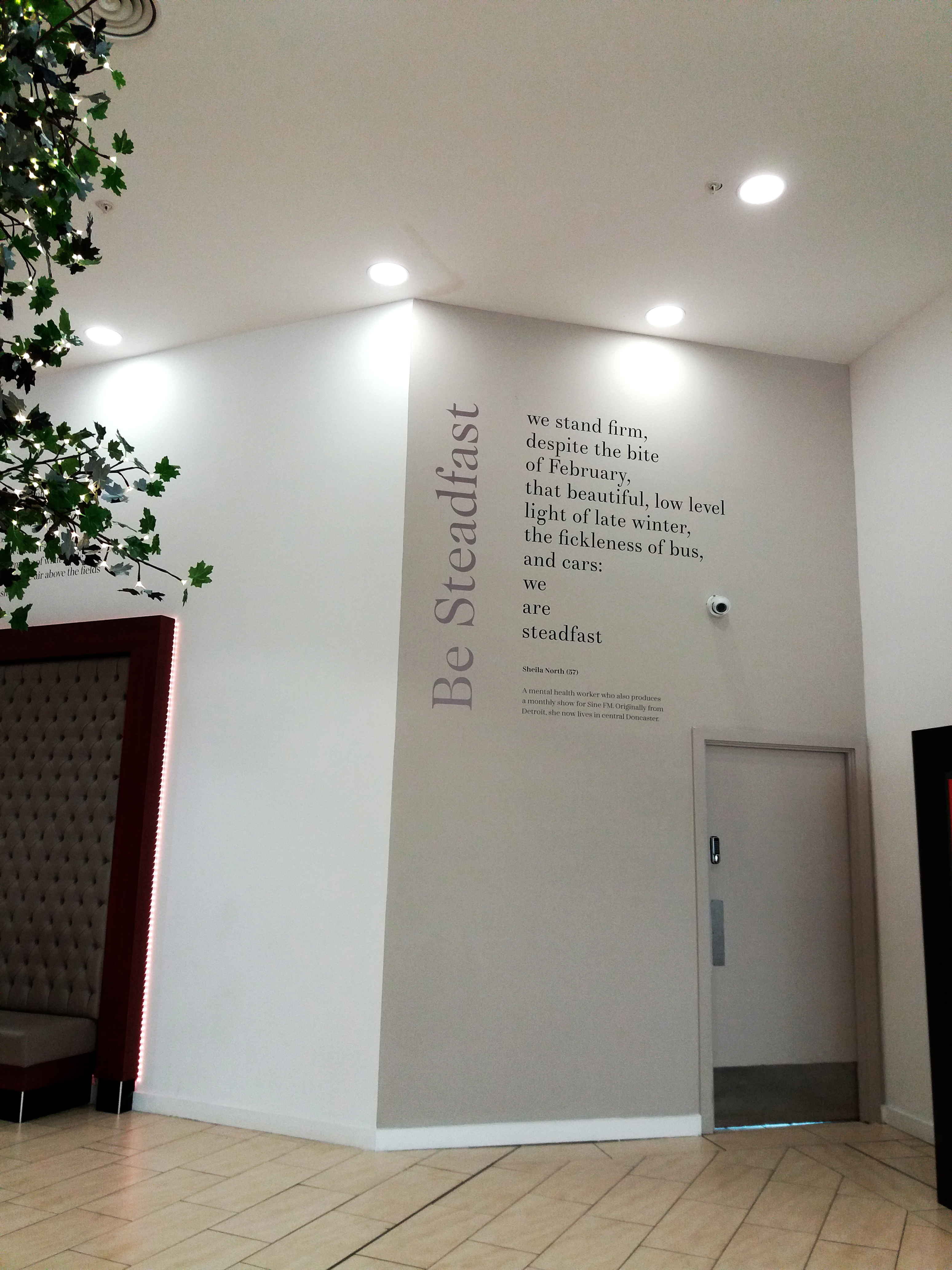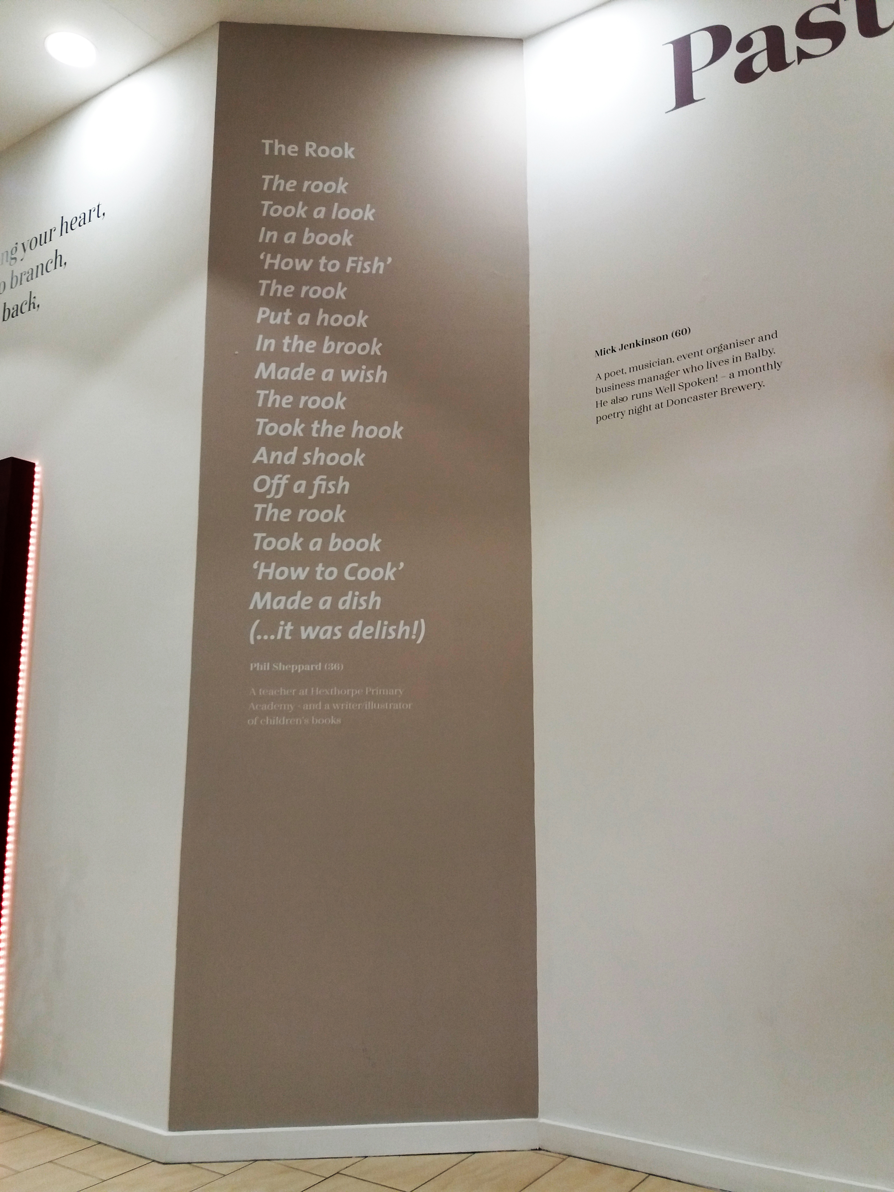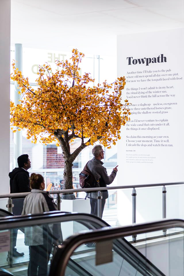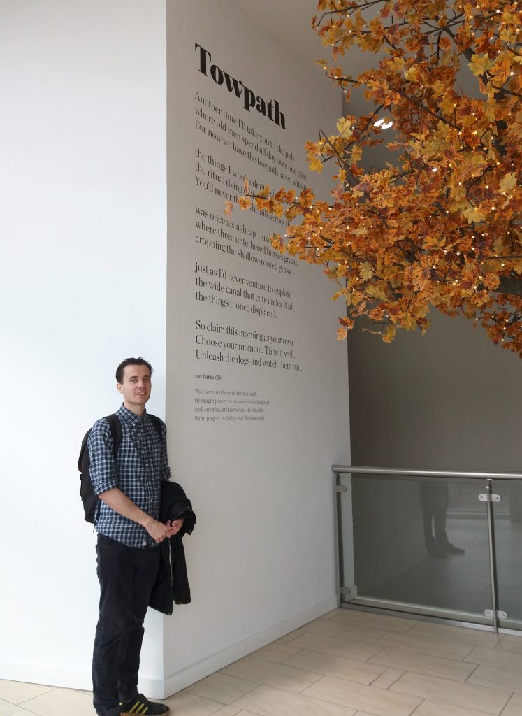 In 2013 a poem called ‘Doncaster’s Dignity’ by Paul Luke was installed in the foyer of Doncaster train station. The poem charts our town’s history, famous buildings and people. With this exhibition, I wanted the poems to work on an even more personal level. I wanted them to showcase what Donny poets are interested in, and what they are experiencing and writing about today. Which is why you will find a real range of poems, including a villanelle about Ed Balls on Strictly Come Dancing, a barista writing your name wrong on your coffee cup, being interrupted by a stranger at a bus stop, and a walk along a towpath in winter.