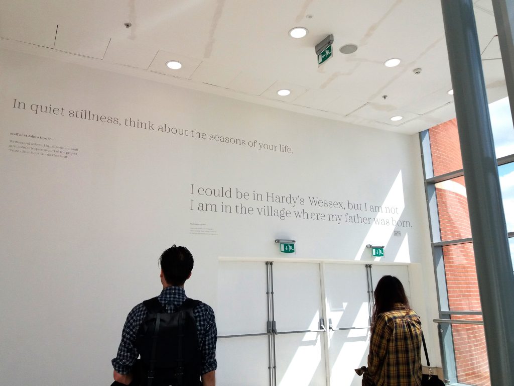 The exhibition also highlights the healing effects of poetry by featuring a St. John’s Hospice project between patients and staff in palliative care. Despite it being one line, it really rings out: ‘In quiet stillness, think about the seasons of your life.’