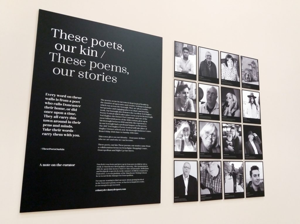 As curator of These poets, our kin / These poems, our stories, I had to be mindful to showcase work which not only made best use of the space, but also connected with the thousands of Donny folk and commuters passing through the centre each and every day.
